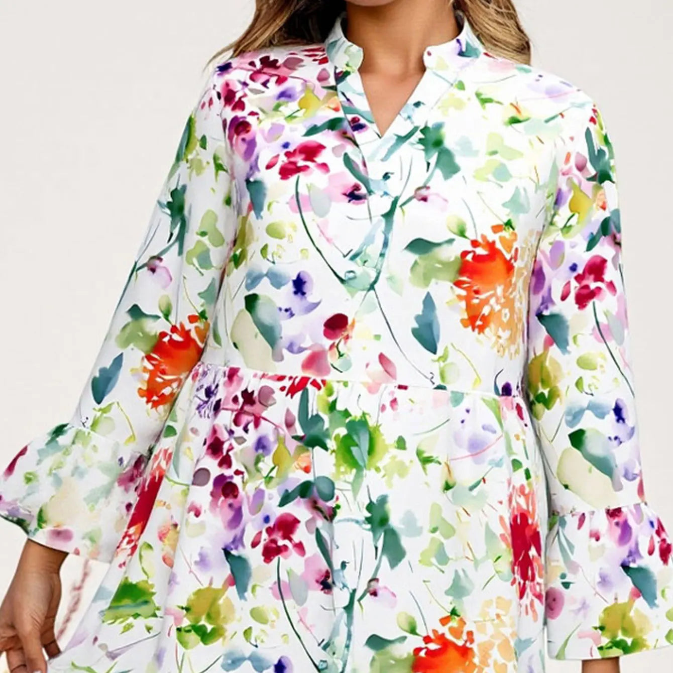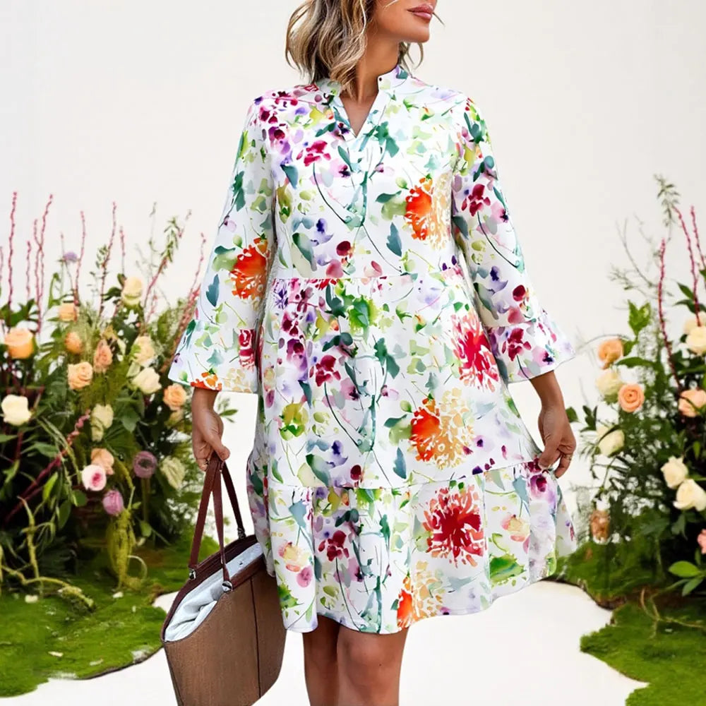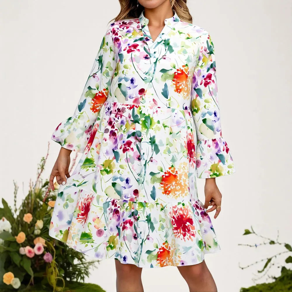 Autumn Dresses 2025 Women's Elegant Basics Plant Full Print Long Sleeve V-Neck Flowy Hem Dresses