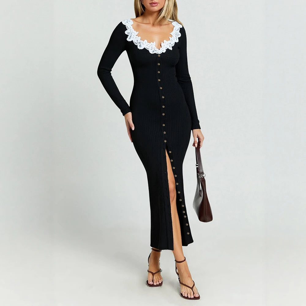 Autumn Summer Dresses 2025 Chic Elegant Contrast Color Single Breasted Lace Long Sleeve V-Neck Midi Long Dresses