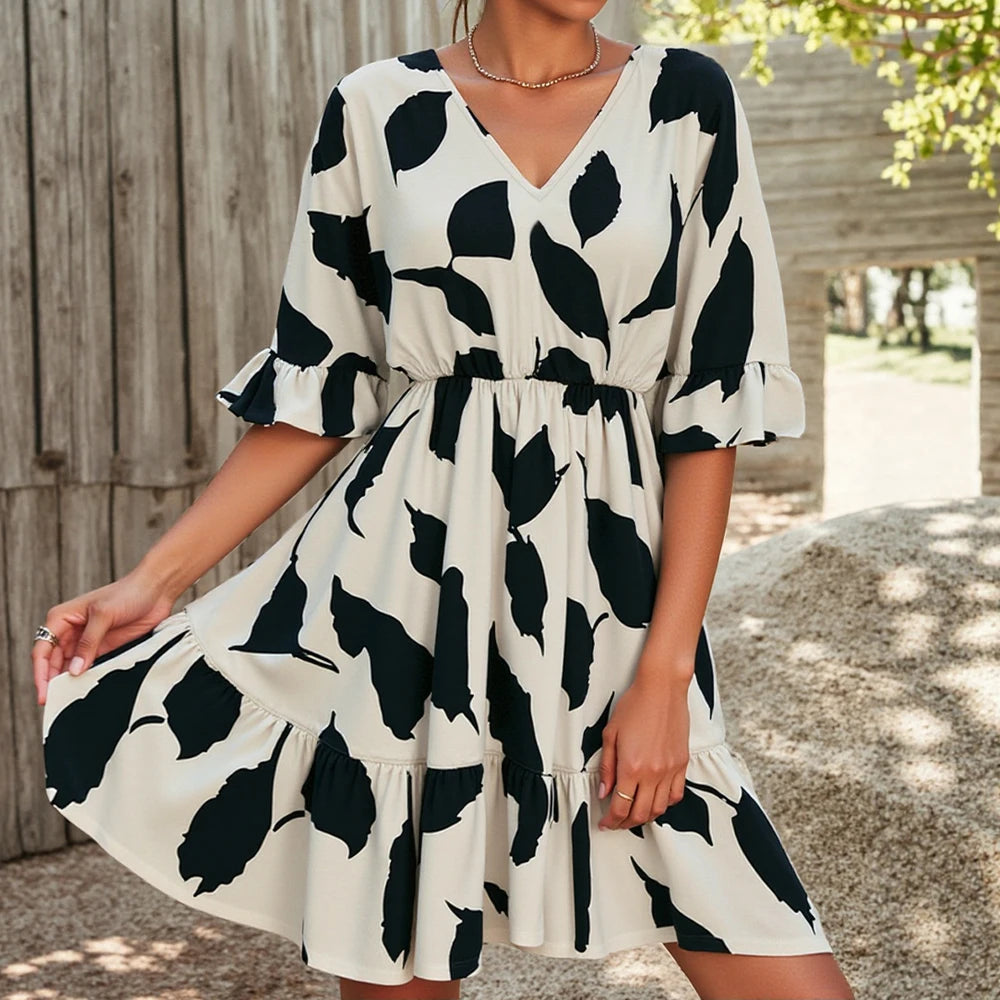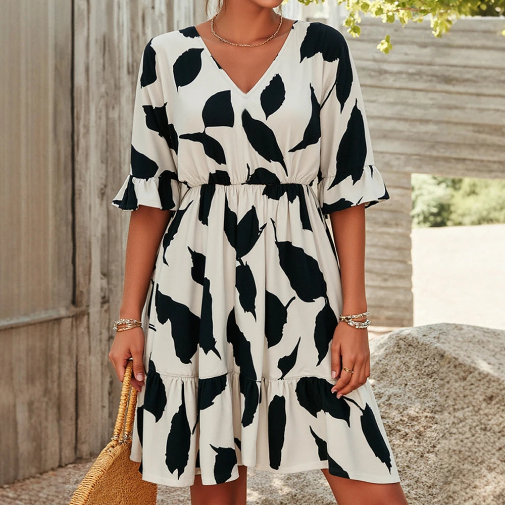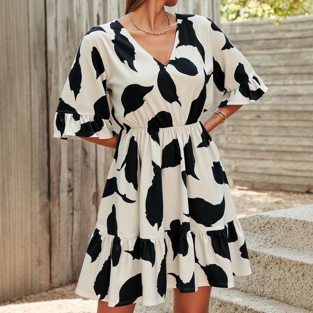 Summer Dress 2025 Women's Casual Contrast Color Ruffle Sleeve V-Neck A-Line Mini Daily Dress