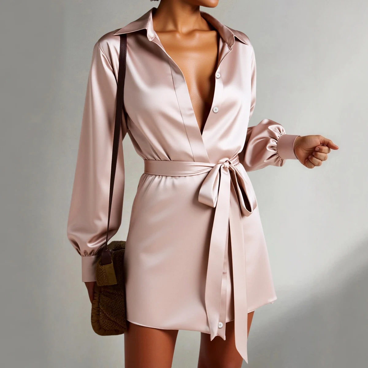 Summer Dress 2025 Women's Elegant Plain Lace-Up Long Sleeve Shirt Collar Mini Office Lady Shirt Dresses