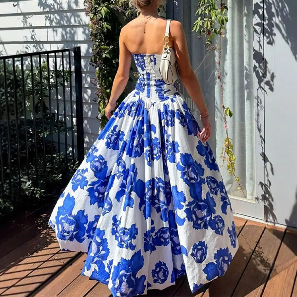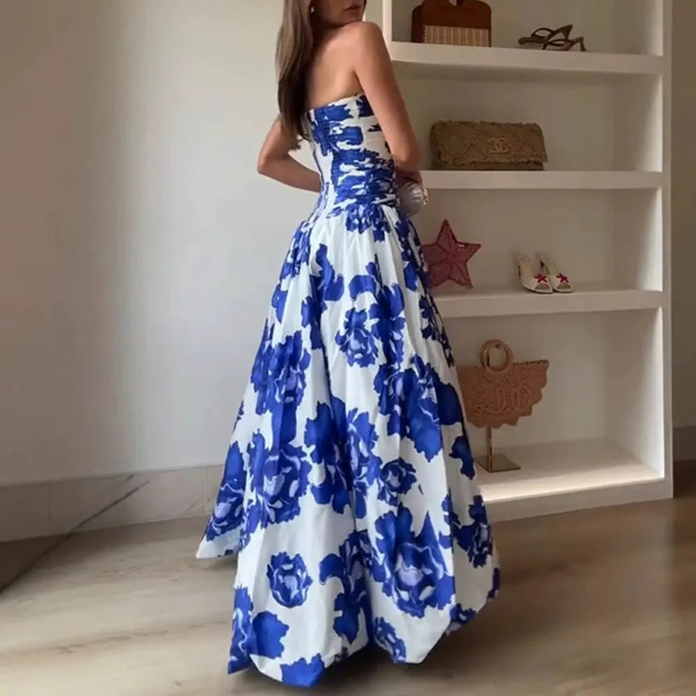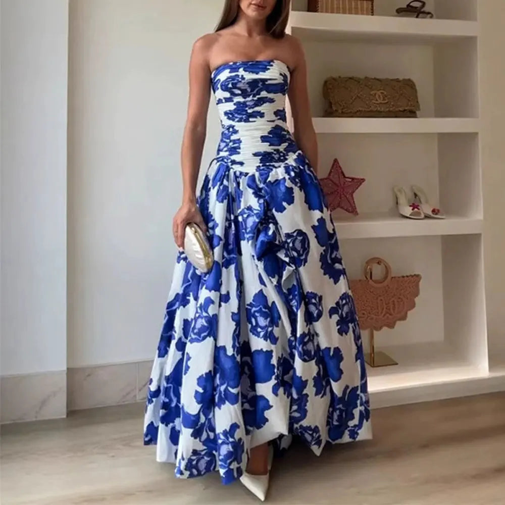 Summer Dresses 2025 Women's Cottagecore Floral Full Print Sleeveless Strapless A-Line Party Midi Dresses