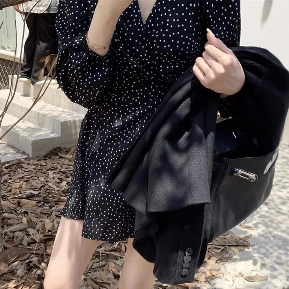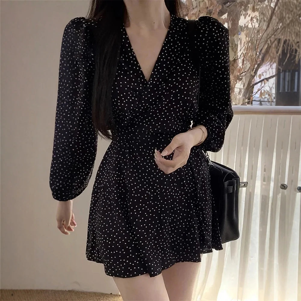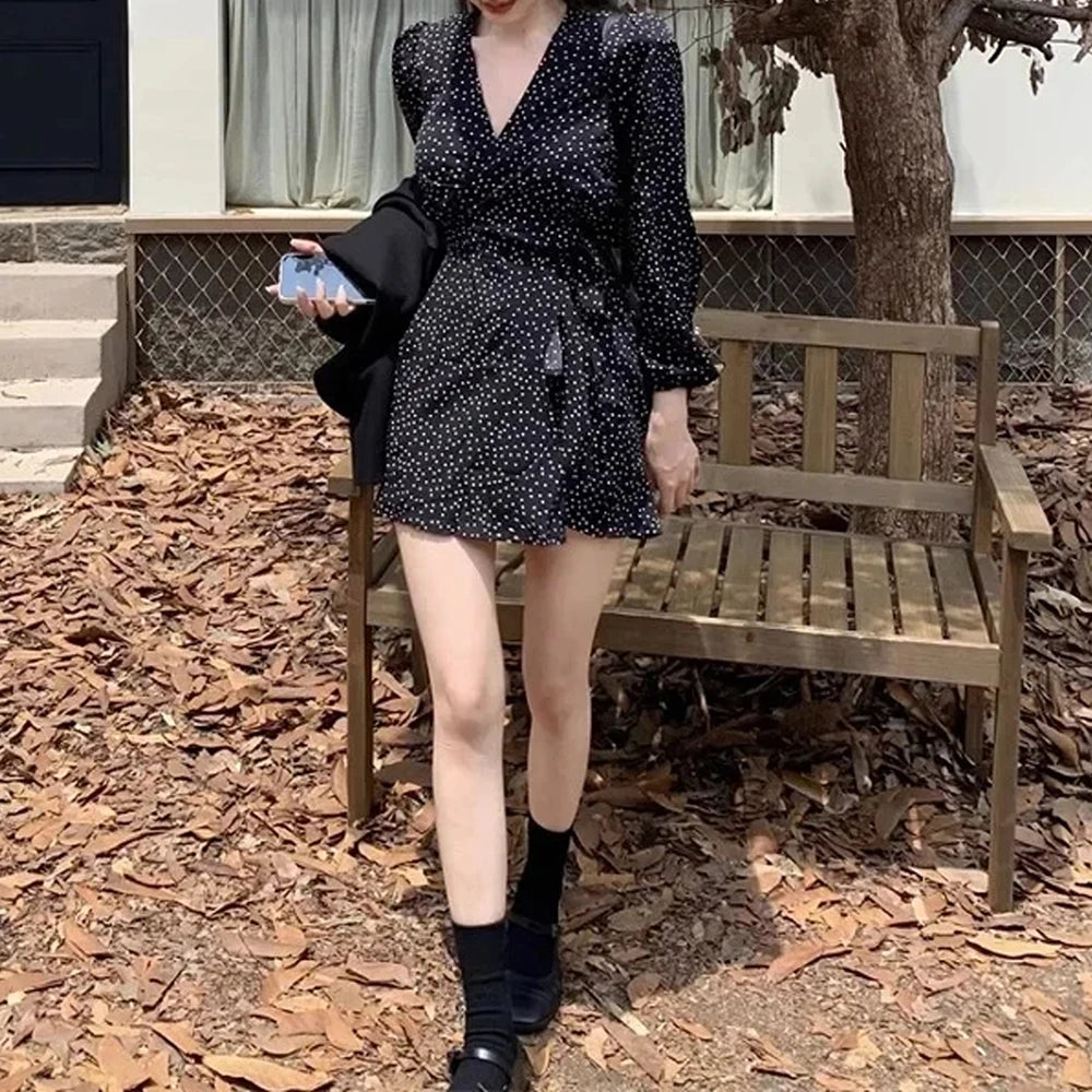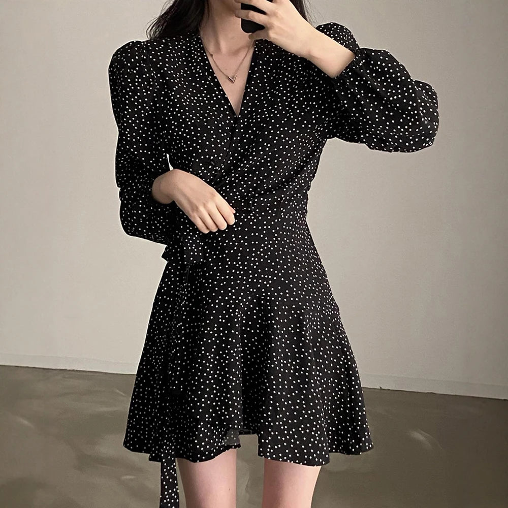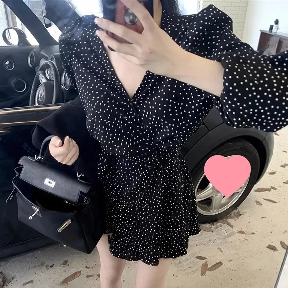 Women's Dresses Summer Casual Office Lady Polka Dot Full Print Lace-Up Puff Sleeve V-Neck Mini A-Line Daily Dresses