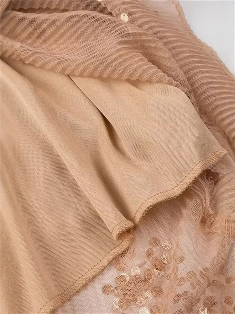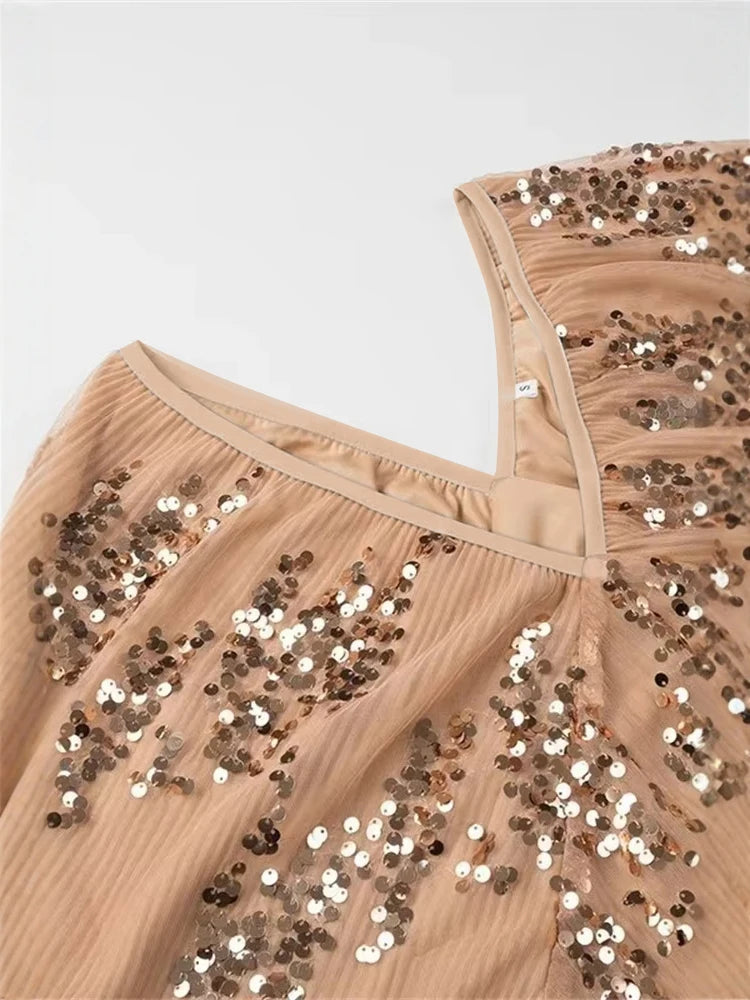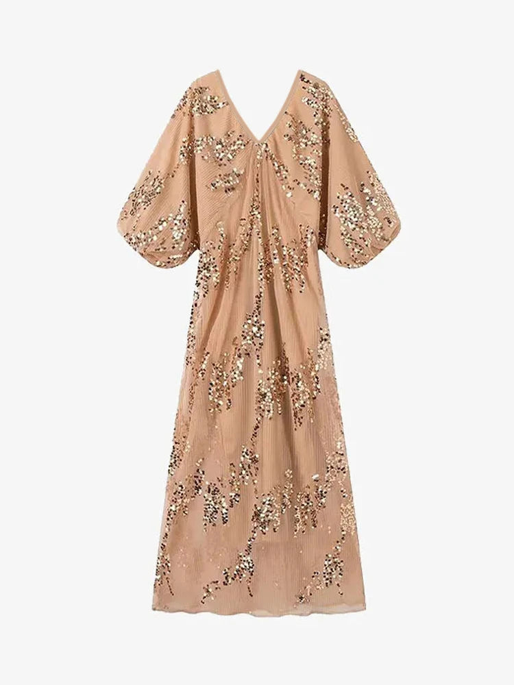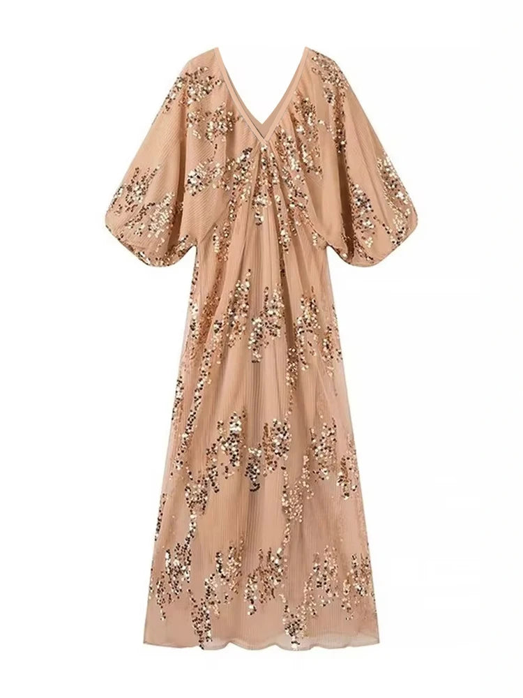 Women's Summer Dress 2025 Long Dresses Comfortable Sequins Puff Sleeve V-Neck Loose Fit Shirt Casual Dresses