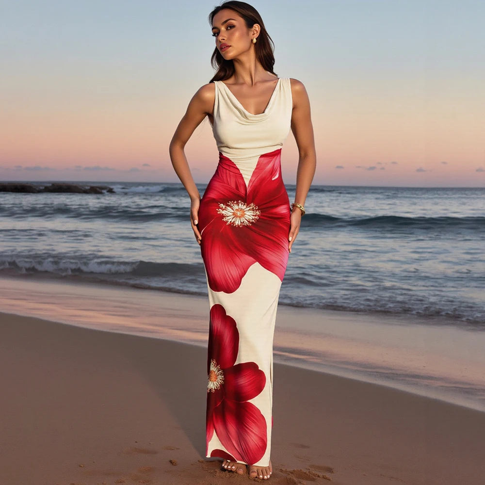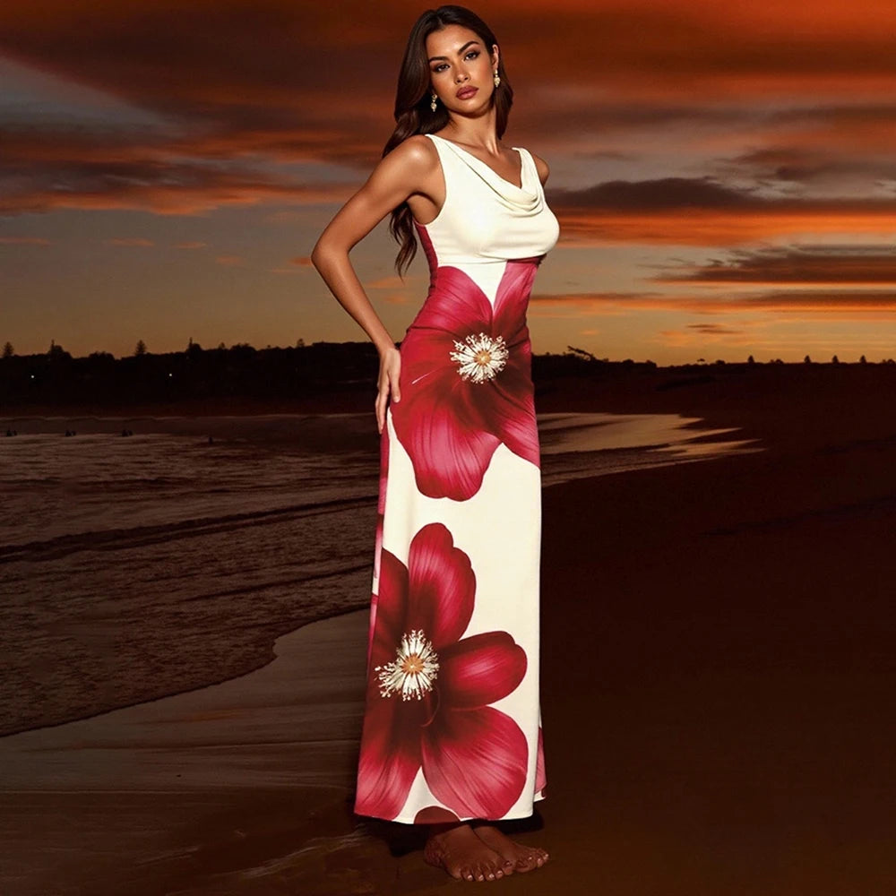 Women's Summer Dress French Sexy Floral Sleeveless Cowl Neck Bodycon Long Dresses Evening Dresses 2025